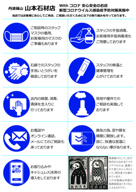 Home › 山本石材店コロナ対策のお願い_A3 (1) 2020-07-17 山本石材店コロナ対策のお願い_A3 (1) 有限会社 山本石材店 墓石のことならお任せください! 終活・生前整理のご相談なども! 住所 〒669-2322兵庫県丹波篠山市呉服町59-11 営業時間 月〜日: 9:00 AM – 5:00 PM (定休日 火曜日) 関連記事 丹波篠山 味まつり 2018 伊能忠敬笹山領探索の会 新聞♪ デカンショ節 歌碑♪で供養 プログラミング教室☆ よくあるお問い合わせ^^; 花筒の困った! 山本石材店コロナ対策のお願い_A3 (1)