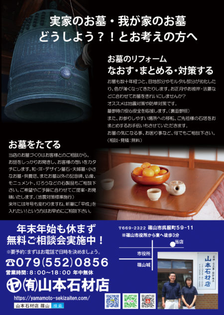 Home › A4縦制作物テンプレート 2018-12-06 A4縦制作物テンプレート 有限会社 山本石材店 墓石のことならお任せください! 終活・生前整理のご相談なども! 住所 〒669-2322兵庫県丹波篠山市呉服町59-11 営業時間 月〜日: 9:00 AM – 5:00 PM (定休日 火曜日) 関連記事 楽天ペイ使えます! 丹波篠山人の密かな愉しみ~ひわの蔵~ お墓のDIY 野花立て 歴史街道ウォーキング「伊能忠敬笹山領測量の道」めぐり 台風… 明日は 二十四節気「大雪」