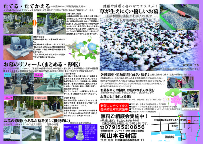 Home › 20200517チラシ_裏 2020-07-17 20200517チラシ_裏 有限会社 山本石材店 墓石のことならお任せください! 終活・生前整理のご相談なども! 住所 〒669-2322兵庫県丹波篠山市呉服町59-11 営業時間 月〜日: 9:00 AM – 5:00 PM (定休日 火曜日) 関連記事 よくあるお問い合わせ^^; 花筒の困った! 丹波篠山 伊能忠敬笹山領測量の道石碑めぐり お墓の雑草をなんとかしたい! 明日は 二十四節気「大雪」 お墓参り代行 20200517チラシ_裏
