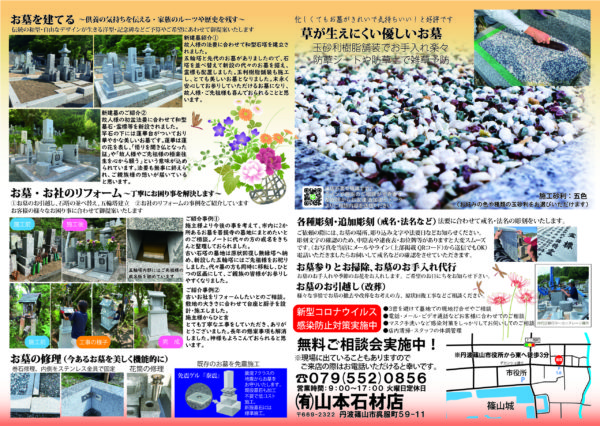 Home › 202109チラシ_裏 2021-09-17 202109チラシ_裏 有限会社 山本石材店 墓石のことならお任せください! 終活・生前整理のご相談なども! 住所 〒669-2322兵庫県丹波篠山市呉服町59-11 営業時間 月〜日: 9:00 AM – 5:00 PM (定休日 火曜日) 関連記事 マスク不足を乗り越える!マスクを清潔に再利用して新型コロナウイルス感染症を予防しよう 台風… 楽天ペイ使えます! 疫病退散・早期終息を祈願!アマビエ様とアマビコ様 お花見 日和 ♪ 202109チラシ_裏