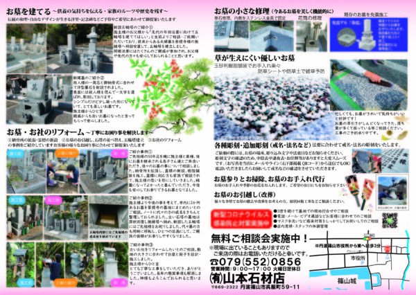 Home › 202201チラシ_裏 2022-01-08 202201チラシ_裏 有限会社 山本石材店 墓石のことならお任せください! 終活・生前整理のご相談なども! 住所 〒669-2322兵庫県丹波篠山市呉服町59-11 営業時間 月〜日: 9:00 AM – 5:00 PM (定休日 火曜日) 関連記事 海洋散骨 空調服に感動 丹波篠山 伊能忠敬笹山領測量の道石碑めぐり プログラミング教室☆ 生前整理♪ 202201チラシ_裏
