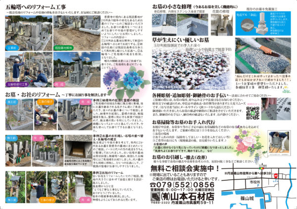 Home › 20250517チラシ_裏 2025-05-24 20250517チラシ_裏 有限会社 山本石材店 墓石のことならお任せください! 終活・生前整理のご相談なども! 住所 〒669-2322兵庫県丹波篠山市呉服町59-11 営業時間 月〜日: 9:00 AM – 5:00 PM (定休日 火曜日) 関連記事 霊標文字彫りをする前には! ㈲山本石材店 2018 夏の思い出 ③ 秋の彼岸ですね アマビエ・アマビコの手ぬぐいあり〼 粉骨サービスについて 20250517チラシ_裏