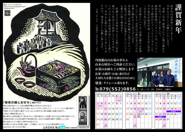Home › 2101チラシ_表 2020-12-31 2101チラシ_表 有限会社 山本石材店 墓石のことならお任せください! 終活・生前整理のご相談なども! 住所 〒669-2322兵庫県丹波篠山市呉服町59-11 営業時間 月〜日: 9:00 AM – 5:00 PM (定休日 火曜日) 関連記事 春のお彼岸にむけて 5月の休業日・定休日の変更のお知らせ プログラミング教室☆ 納骨所の作成 お墓の撤去作業 2101チラシ_表